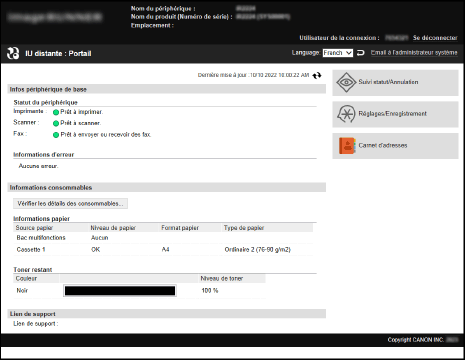 Lorsque vous vous connectez à l'interface utilisateur distante, la page Portail (page d'accueil de l'interface utilisateur distante) s'affiche. Depuis cette page, vous pouvez vérifier l'état d'utilisation de l'appareil, afficher diverses informations et changer les paramètres au moyen de boutons.