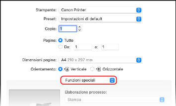 2 | Dal menu a comparsa delle opzioni di stampa, selezionare [Funzioni speciali]. Se non vengono visualizzate opzioni di stampa, fare clic su [Mostra dettagli] nella finestra di dialogo di stampa. |