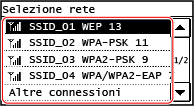 Cercare il router di una LAN wireless (punto di accesso) a cui connettersi e inserire la chiave di rete. Quando ci si connette con il metodo di configurazione del punto di accesso, si impostano i seguenti metodi di autenticazione e crittografia: Metodo di autenticazione WEP: sistema aperto Crittografia per WPA/WPA2: si imposta automaticamente AES-CCMP o TKIP in base al router della LAN wireless selezionato. Per specificare un metodo di crittografia o autenticazione diverso, usare il metodo di configurazione manuale per connettersi. Connessione a una LAN wireless mediante impostazione dei dati (metodo di configurazione manuale) |