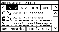 Wenn Sie das Adressbuch über den Bildschirm [Startseite] aufrufen und eine Zieladresse auswählen, wird der Scan- oder Faxbildschirm mit Angabe der ausgewählten Adresse angezeigt.