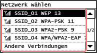 Suchen Sie nach einem WLAN-Router (Zugangspunkt), mit dem Sie eine Verbindung herstellen möchten, und geben Sie den Netzwerkschlüssel ein. Wenn Sie eine Verbindung mit der Zugangspunkt-Einrichtungsmethode herstellen, werden die folgenden Authentifizierungs- und Verschlüsselungsmethoden festgelegt: WEP-Authentifizierungsmethode: Offenes System Verschlüsselung für WPA/WPA2: AES-CCMP oder TKIP wird automatisch entsprechend dem ausgewählten WLAN-Router festgelegt. Um eine andere Authentifizierungs- oder Verschlüsselungsmethode festzulegen, verwenden Sie die manuelle Einrichtungsmethode für die Verbindung. Verbinden mit einem drahtlosen LAN durch Einstellen der Details (manuelle Einrichtungsmethode) |