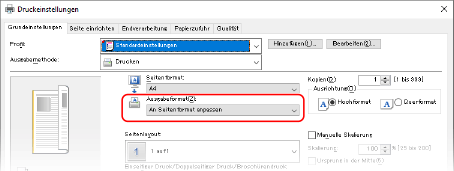 Passen Sie [Ausgabeformat] im Druckertreiber an das Papierformat an, auf dem gedruckt werden soll.