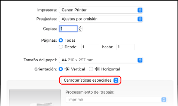En el menú emergente de opciones de impresión, seleccione [Características especiales].