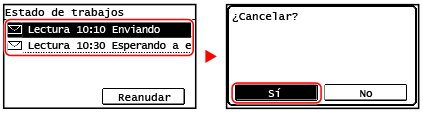 Si apareciera la pantalla de la lista de trabajos, seleccione el trabajo que desee cancelar y pulse [Sí].