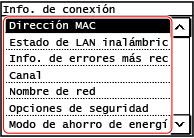 Además de la dirección MAC y la información de conexión de la LAN inalámbrica cuando la máquina esté conectada a una LAN inalámbrica, puede ver las opciones de seguridad.