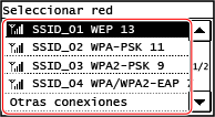 Busque un router de LAN inalámbrica (punto de acceso) al que desee conectarse e introduzca la clave de red. Al conectar con el método de configuración del punto de acceso, se establecen los siguientes métodos de autenticación y cifrado: Método de autenticación WEP: sistema abierto Cifrado WPA/WPA2: se establece automáticamente la opción AES-CCMP o TKIP según el router de LAN inalámbrica que se seleccione. Para especificar otro método de autenticación o cifrado, utilice el método de configuración manual para establecer la conexión. Conexión a una LAN inalámbrica mediante la configuración de los detalles (método de configuración manual) |