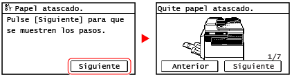 No retire el papel atascado en la máquina por la fuerza por la fuerza.Si retira el papel a la fuerza, podría sufrir lesiones personales o dañar piezas de la máquina. Si no puede retirar el papel, póngase en contacto con su distribuidor o representante del servicio técnico. Cuando se hayan eliminado todos los atascos de papelSaque inmediatamente las manos de la máquina y del equipo opcional para evitar que la ropa y las manos queden atrapadas en los rodillos. |