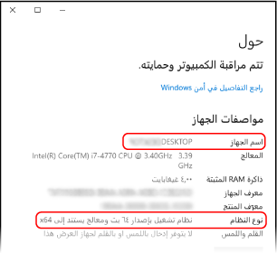 إذا كان نظام التشغيل بالكمبيوتر 64-بت، فسيُعرض system, "نظام التشغيل ٦٤ -بت".