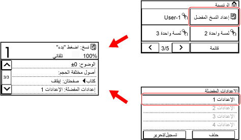 يمكنك استدعاء الإعدادات المسجلة للتشغيل السريع باستخدام زر [إعداد النسخ المفضل] على الشاشة [الرئيسية] أو من شاشة وظيفة النسخ. يمكنك أيضًا تغيير الإعدادات بعد استدعائها، حسب الحاجة.
