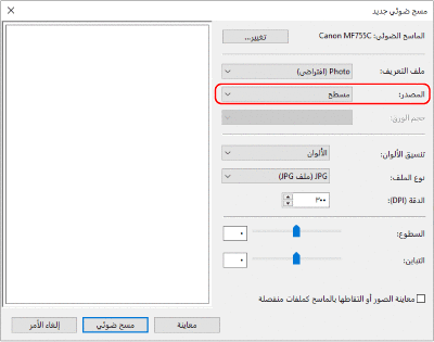 وعند إجراء مسح ضوئي لمستند أصلي بكميات كبيرة من النص، حدد [مستند]. عند مسح إحدى الصور ضوئيًا، حدد [صورة (افتراضي)].