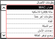 بالإضافة إلى عنوان MAC ومعلومات اتصال شبكة LAN اللاسلكية عندما يكون الجهاز متصلًا بشبكة LAN اللاسلكية، يمكنك أيضًا عرض إعدادات الأمان.