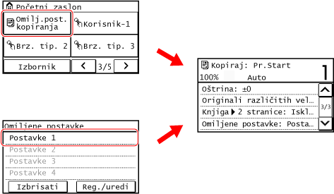 Registrirane postavke radi brze primjene možete aktivirati uz pomoć gumba [Omilj.post. kopiranja] na zaslonu [Početni zaslon] ili na zaslonu funkcije kopiranja. Nakon učitavanja postavke se po potrebi mogu i mijenjati.