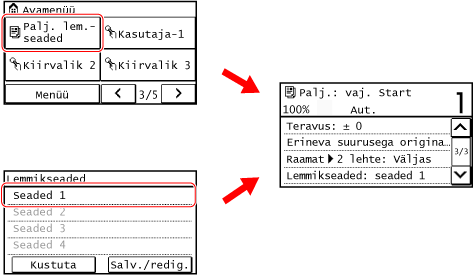Saate kuvada registreeritud sätteid kiiresti kasutamiseks nupuga [Palj. lem.- seaded] kuval [Avamenüü] või paljundamise funktsiooni kuval. Samuti saate sätteid pärast nende kuvamist vastavalt vajadusele muuta.