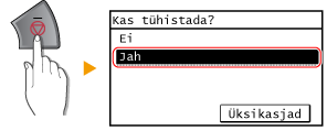 juhtpaneelil  [Paljundus-/prinditöö]  [Töö olek]  valige [Prinditöö olek] ekraanil tühistatav töö  [Tühista]  [Jah]