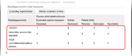 Amikor engedélyezve van a részlegazonosító-kezelés, minden részlegazonosítóhoz megtekintheti a nyomtatott és másolt oldalak számát.