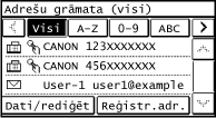 Adrešu grāmatā reģistrētos adresātus norādīt var, izsaucot adrešu grāmatu ekrānā [Sākums] vai vadības paneļa skenēšanas vai faksa lietošanas ekrānā.