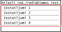 Izlases iestatījumu reģistrēšanai izmantojiet vadības paneli. Izlases iestatījumus nevar reģistrēt, izmantojot līdzekli Remote UI (Attālais lietotāja interfeiss) no datora.