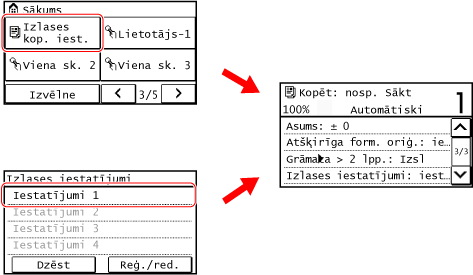 Reģistrētos iestatījumus ātrai izmantošanai var izsaukt no [Izlases kop. iest.] pogas ekrānā [Sākums] vai no kopēšanas funkcijas ekrāna. Pēc to izsaukšanas iestatījumus var arī mainīt, ja nepieciešams.