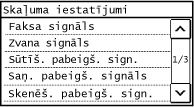 [Faksa signāls] / [Zvana signāls] / [Sūtīšanas pabeigšanas signāls] / [Saņemšanas pabeigšanas signāls] / [Skenēšanas pabeigšanas signāls]