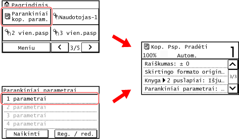 Galite iškviesti užregistruotus parametrus, kad galėtumėte greitai atlikti veiksmus, paspaudę mygtuką [Parankiniai kop. param.] ekrane [Pagrindinis] arba kopijavimo funkcijos ekrane. Taip pat, jei reikia, galite pakeisti iškviestus parametrus.