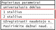 Pagal numatytuosius nustatymus popieriaus stalčiaus popieriaus dydis ir tipas yra nustatytas į A4 ir 2 paprastas. Jei įdėtas kitokio formato ar tipo popierius, pakeiskite popieriaus parametrus.