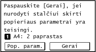 Jei [Priminti patikrinti popieriaus parametr.] reikšmė yra nustatyta į [Įjungta], rodomas aukščiau pateiktas ekranas. Jei norite pakeisti parametrus, pradėkite nuo [Pop. param.].