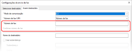No separador [Inserir destinatário], introduza um número de fax. Quando for possível introduzir [Confirmar número de fax], introduza o mesmo número de fax.