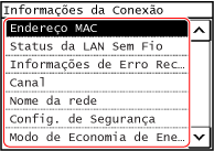 Além do endereço MAC e das informações de ligação da LAN sem fios, quando a máquina está ligada à LAN sem fios, também pode ver as definições de segurança.