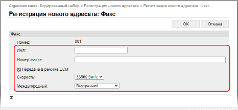 Если при отправке факса по зарегистрированному номеру возникает ошибка или она выполняется медленно, введите сведения, необходимые для отправки факса.