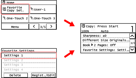 Позивање омиљених подешавања из [Favorite Copy Set.] дугме на [Home] екрану