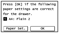 Када [Notify to Check Paper Settings] је подешен на [On], приказује се горњи екран. Ако желите да промените подешавања, почните од [Paper Set.].