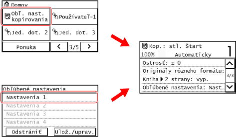 Uložené nastavenia pre rýchlu obsluhu môžete vyvolať tlačidlom [Obľ. nast. kopírovania] na obrazovke [Domov] alebo z obrazovky funkcie kopírovania. Nastavenia môžete podľa potreby zmeniť aj po ich vyvolaní.