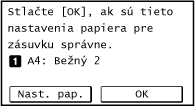 Ak je položka [Upozorniť na kontrolu nastavení papiera] nastavená na možnosť [Zap.], zobrazí sa vyššie uvedená obrazovka. Ak chcete tieto nastavenia zmeniť, začnite od časti [Nast. pap.].