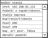 . Na tem zaslonu si lahko ogledate informacije o napravi, uporabi in dnevnikih, nastavitve omrežja in informacije o napakah. Zaslon [Nadzor stanja]