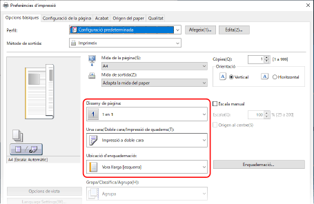 [Ordre de pàgines] [Una cara/Doble cara/Impressió de quaderns] [Ubicació d'enquadernació].