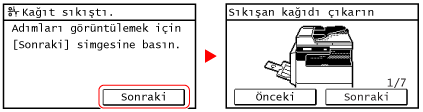 Sıkışan kağıdı makineden zorlayarak çıkarmayın.Kağıdın zorla çıkarılması, fiziksel yaralanmaya veya makinenin parçalarının hasar görmesine neden olabilir. Kağıdı çıkaramıyorsanız satıcınıza veya servis temsilcinize başvurun.