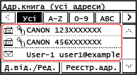 Під час зазначення адресатів викликом адресної книги з екрана [Головний] або екрана сканування чи надсилання факсів використовуйте список адресатів.