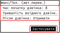 Якщо параметр [Факс/Телефон (автоматичне переключення)] увімкнено для визначення того, чи вхідний виклик є факсом, можна також налаштувати параметри, як-от час дзвінка.