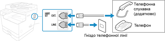 Підключіть телефонний шнур із комплекту постачання до гнізда підключення телефонної лінії (LINE) на апараті та роз’єму для телефонної лінії на стіні.