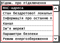 Крім MAC-адреси та відомостей про підключення до безпровідної локальної мережі в разі підключення апарата до неї, можна також переглянути параметри безпеки.