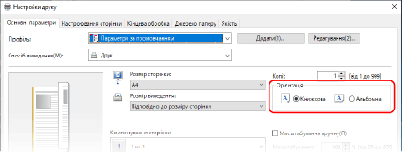 На екрані [Основні параметри] драйвера встановіть для параметра [Орієнтація] таке саме значення орієнтації, що було встановлено під час кроку 1.