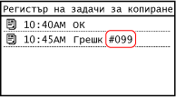 Ако отпечатването не може да се извърши или възникне друга грешка, в регистъра на заданията се показва код на грешка (трицифрено число, започващо с „#“).