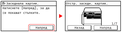 Не изваждайте със сила заседнала хартия от машината.Изваждането на хартията със сила може да доведе до нараняване или повреда на части на машината. Ако не можете да извадите хартията, обърнете се към вашия търговец или сервизен представител.