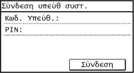 Όταν έχει οριστεί αναγνωριστικό υπεύθυνου συστήματος, η οθόνη σύνδεσης εμφανίζεται για τις λειτουργίες που απαιτούν δικαιώματα διαχειριστή. Εισαγάγετε το αναγνωριστικό και το PIN του υπεύθυνου συστήματος για να συνδεθείτε.