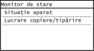 de pe panoul de control. Utilizați acest ecran pentru a verifica informațiile aparatului, utilizarea și jurnalele și informațiile de eroare. Ecranul [Monitor de stare]