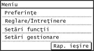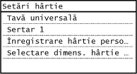 Modificarea afișajului de pe ecranPuteți modifica afișajul de pe panoul de control, de exemplu prin modificarea limbii de afișare și a unităților, respectiv prin afișarea sau ascunderea mesajelor. [Setări afişaj]
