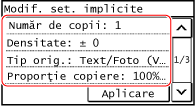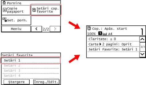 Puteți apela setările înregistrate pentru operare rapidă folosind butonul [Setări cop. favorite] de pe ecranul [Pornire] sau de pe ecranul funcției de copiere. Puteți modifica setările și după apelarea acestora, după cum este necesar.