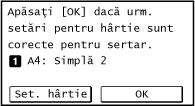 Când [Notificare pt. verificare setări hârtie] este setat la [Pornit], se afișează ecranul de mai sus. Dacă doriți să modificați setările, începeți de la [Set. hârtie].