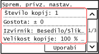 Nastavitve lahko prikličete tako, da pritisnete gumb [Prilj. nas. kopiranja] na zaslonu [Domov].