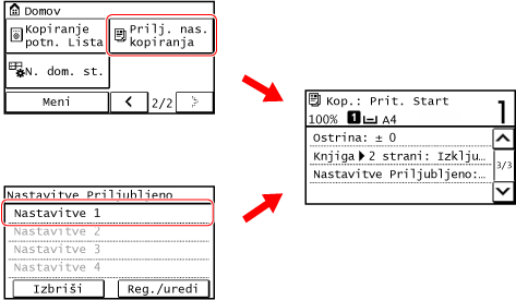 Registrirane nastavitve lahko prikličete za hitro uporabo z gumbom [Prilj. nas. kopiranja] na zaslonu [Domov] ali na zaslonu za funkcije kopiranja. Nastavitve lahko po potrebi spremenite tudi po njihovem priklicu.